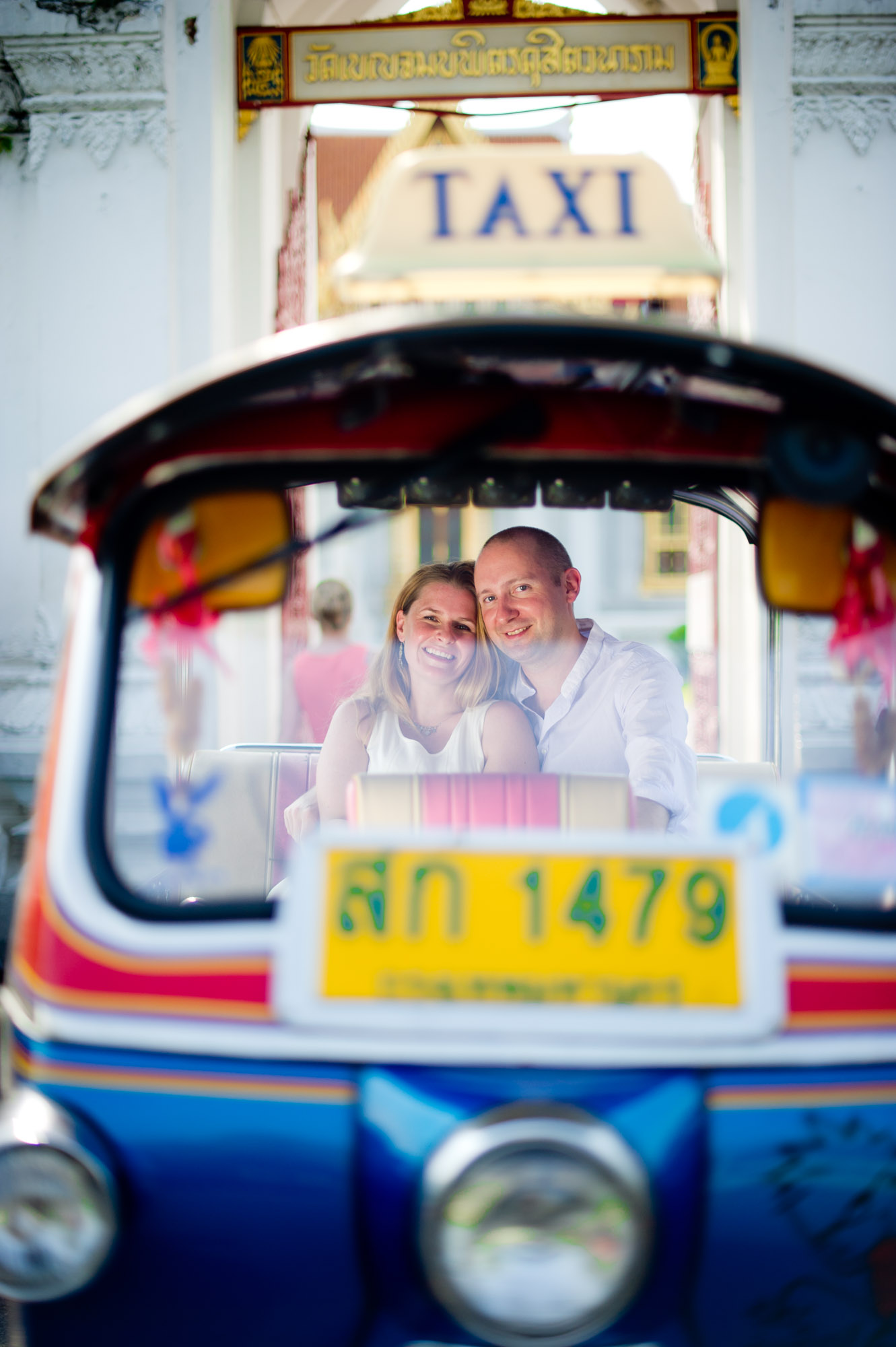 As we were finishing at the Marble Temple, the couple saw a Tuk Tuk (Rickshaw) and asked us if they could take some photos with it. Not only did we take photos with it, they were able to sit in the back of the Tuk Tuk as well. The Tuk Tuk driver got some tip and we were all happy.