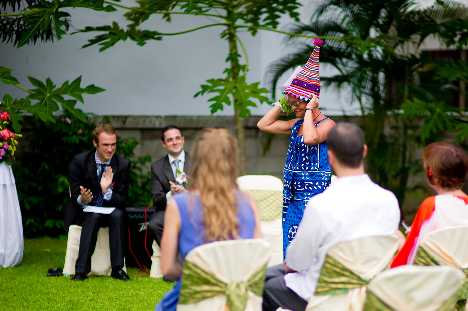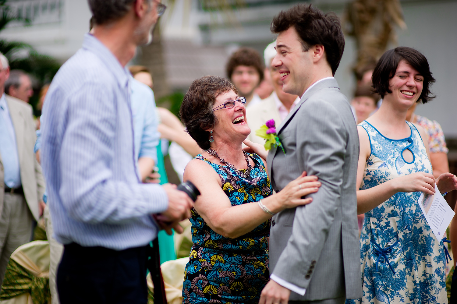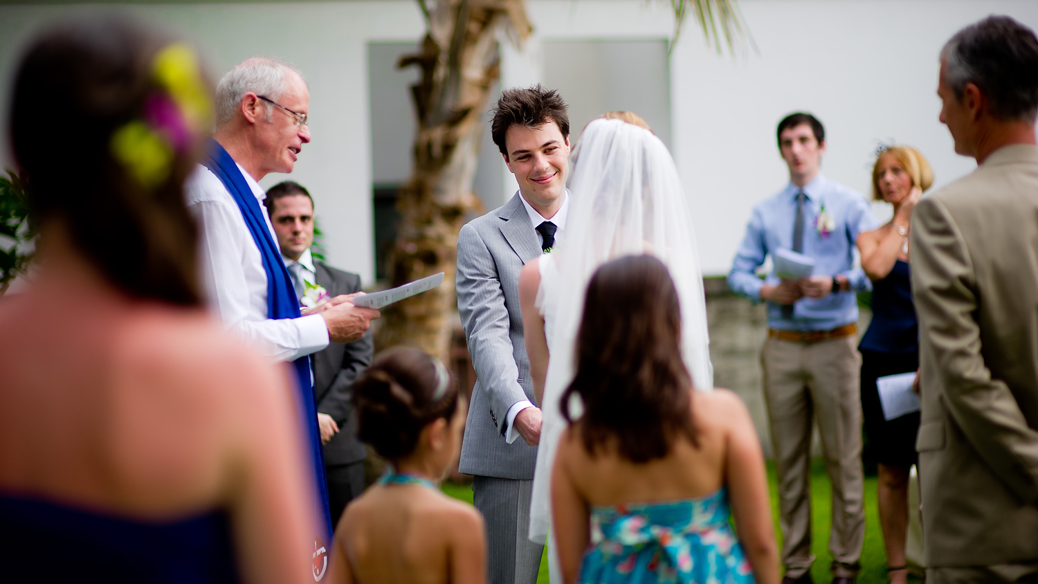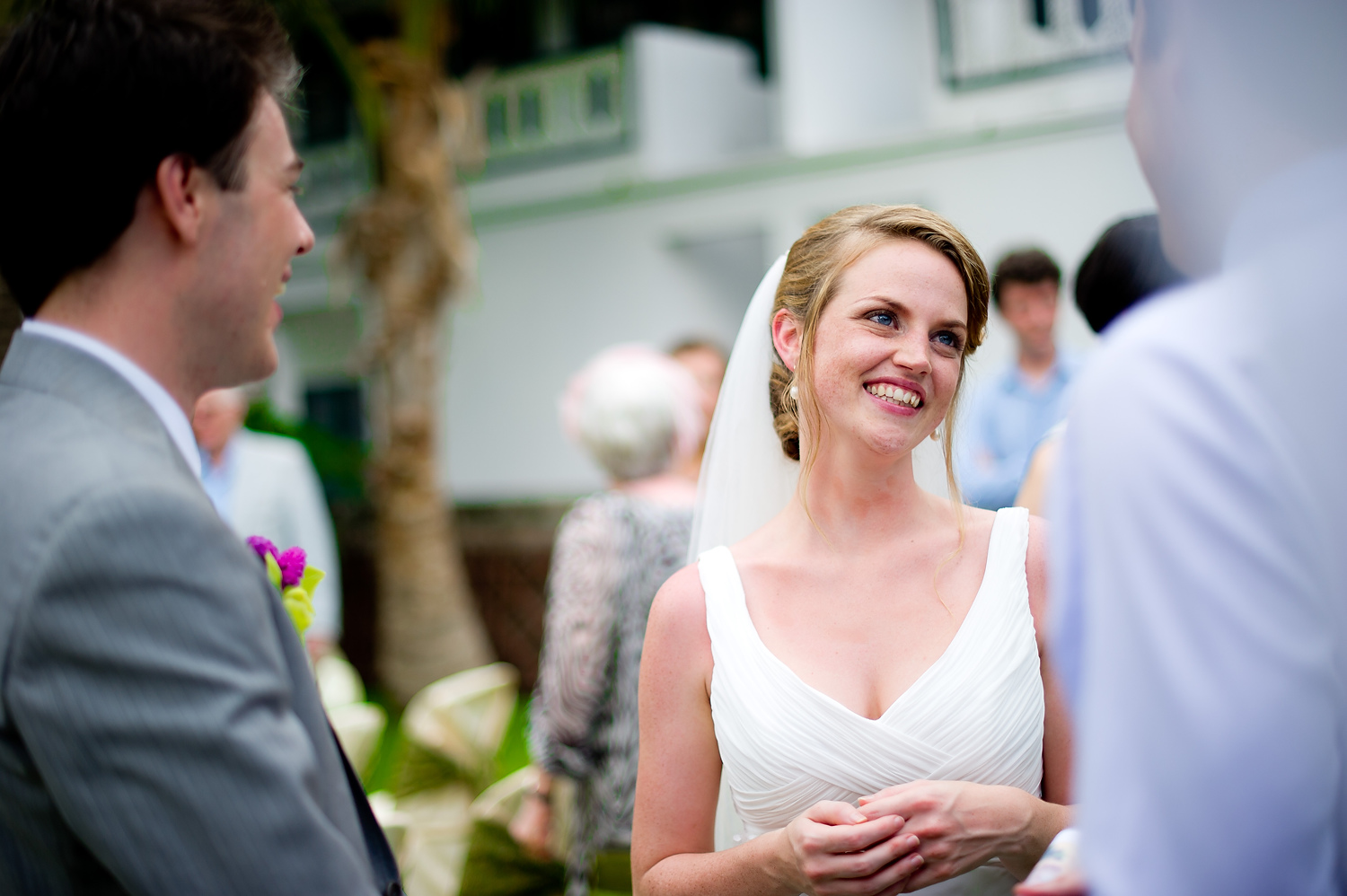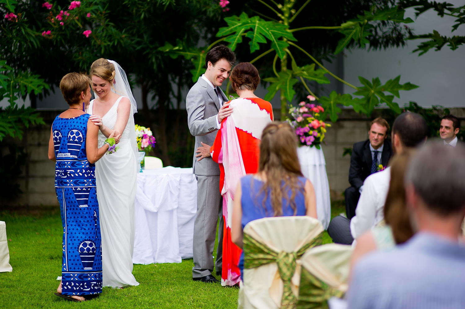 The wedding ceremony was held on a lawn right outside her rented house in Hua Hin. It was a beautiful and intimate ceremony. After the ceremony, the wedging couple rode an elephant down to a beach where we took some portraits of the couple, and with their wedding guests.