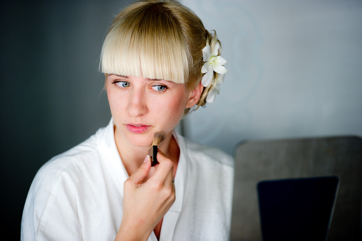 They both were getting ready in their own separate room. I had a lot of light shining through big windows and doors.