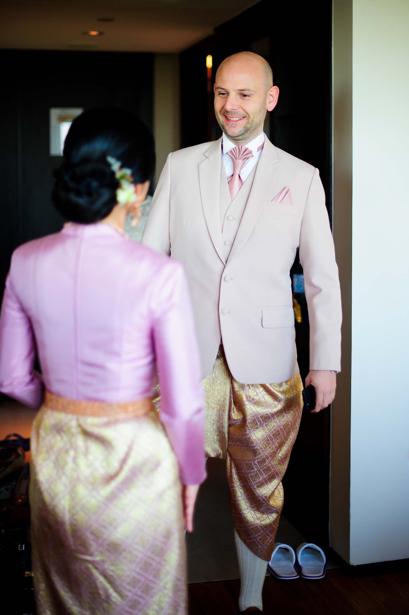Groom looking at his bride in her Thai wedding dress.